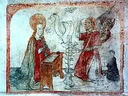 Dans la chapelle nord, une représentation de l’Annonciation caractéristique de la deuxième moitié du XVe siècle est remarquablement conservée.