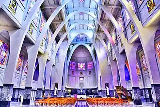 - Intérieur : L’intérieur est lumineux. Espace et volume sont déterminés par des colonnes qui forment des arcs paraboliques élancés vers le centre, créant une nef de haute dimension, et d’autres plutôt symboliques vers les deux bas-côtés, dont l’espace est à peine séparé de celui de la nef. Les six arcs de la nef ont 23 mètres de haut. L’ensemble semble inspiré du travail architectural d'Henry Lacoste et l'église en béton de 1919 sise à Bléharies ( Tournai) et peut-être d’Auguste Perret que Joseph Diongre semblerait avoir connu. Le travail des vitraux et les compositions béton-verre font penser à l’église Notre-Dame du Raincy, de Paris. Les vitraux non figuratifs proviennent de l’atelier bruxellois de Frans David Crickx (1893-1979).