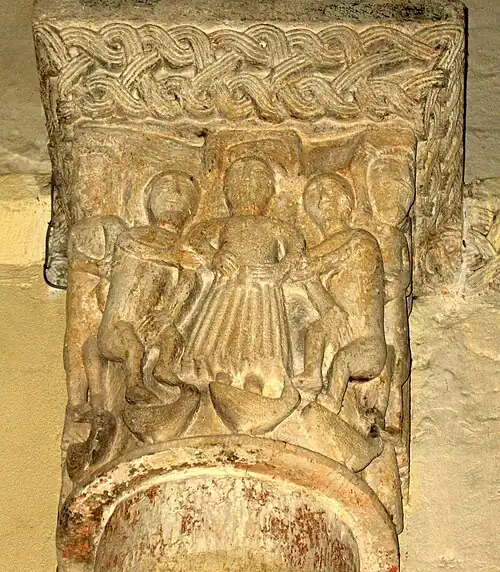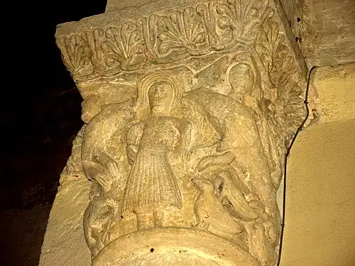 - « Daniel entre des lions et des oiseaux, deux têtes humaines aux angles ; tailloir orné de rinceaux de palmettes (chapiteau nord) ; le Christ (?) au centre de la face antérieure, encadré par deux hommes nus marchant de chaque côté, un homme vêtu d'une robe et nimbé sur chaque face latérale, tous les personnages sont posés au-dessus de 5 oiseaux la tête levée vers eux ; tailloir orné d'entrelacs (chapiteau sud). »