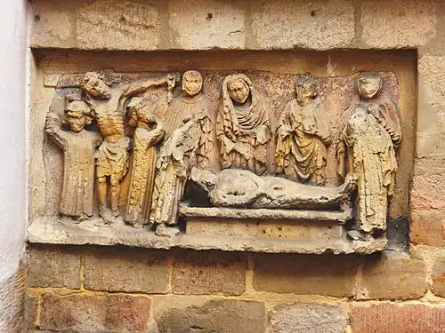Au sud, il y a un grand bas-relief de grès patiné d'environ 1400 représentant la Descente de Croix et la Mise au tombeau du Christ. À l'extérieur de la chapelle Sainte-Anne, l'on remarque des représentations de l'Homme des douleurs en buste du premier tiers du XVe siècle et la tête d'une statue féminine, probablement du début du XIVe siècle.