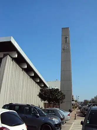 Le clocher, fait de deux lames de béton, s'élève à environ vingt-cinq mètres.