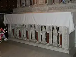 L'ancien maître-autel est en marbre blanc avec six colonnettes en marbre rouge.