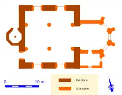 L'aspect extérieur est profondément modifié. La tourelle orientale est démolie en 1874 — ses vestiges se devinent encore en partie supérieure — et remplacée par une abside à cinq pans dont deux sont éclairés par des rosaces et trois par de grandes baies en ogives[6] ; certains vitraux qui les garnissent proviennent de l'atelier de Julien-Léopold Lobin[6]. Dans un second temps, une sacristie est construite contre le flanc méridional de l'abside ; une chapelle, en vis-à-vis contre le flanc septentrional de l'abside, prévue sur les plans initiaux, n'est en définitive pas édifiée[6]. La toiture de la tourelle occidentale est démontée ; la tourelle elle-même est rehaussée en maçonnerie dans le même style que la partie basse et une flèche en bois recouverte d'une toiture en ardoise vient chapeauter l'ensemble qui devient le clocher ; l'escalier à vis d'origine reste fonctionnel[4].