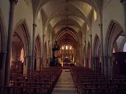 L'église présente le plan couramment répandu du XIIIe au XIVe siècle : une nef de deux étages d'arcades et de baies, et des bas-côtés couvert d'un toit indépendant[1].