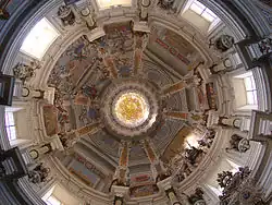 L'intérieur est organisé selon un plan en croix grecque, dotée d'absides semi-circulaires. Une splendide coupole peinte de fresques de Lucas Valdés représentant le mystère de l'Eucharistie, coiffe l'ensemble[2].