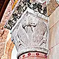 Le portail occidental est surmonté d'un tympan nu, encadré par une archivolte composée d'un gros tore retombant latéralement sur deux colonnes à bases et chapiteaux sculptés de motifs végétaux, notamment de grenades, fruit symbole de l'immortalité.