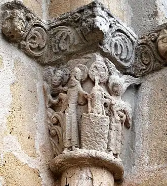 Le tailloir a bien résisté à l'érosion. On y voit une frise ou alternent des animaux, des masques cracheurs de rinceaux et des feuilles palmées.