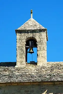 La toiture de lauzes est surmontée d'un élégant clocheton carré à quatre baies campanaires, sommé d'un toit de lauzes à flèche pyramidale.