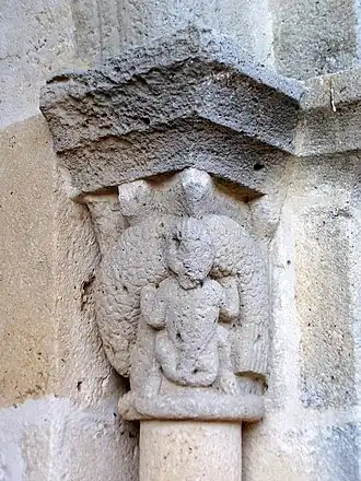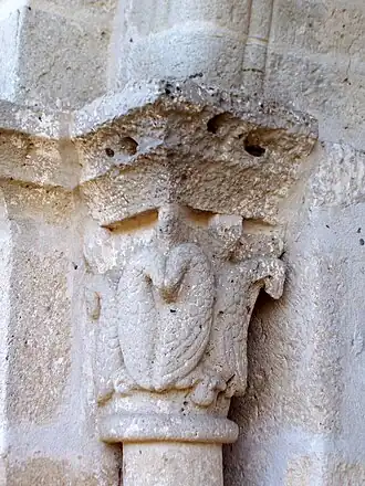 Les trois chapiteaux non-historiés sont assez communs : feuilles d'acanthe, arbre avec fruits, fougères. Le chapiteau historié à l'ouest du portail : deux couples d'oiseaux adossés et s'affrontant sur l'angle de la corbeille, est aussi banal et assez fréquent dans la région. Par contre, les chapiteaux historiés à l'est du portail et au nord de l'arc triomphal sont très surprenants. Le premier est une évocation de l'homosexualité et le deuxième de la pédophilie.