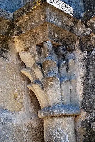 Le chapiteau nord : Les trois faces de la corbeille sont sculptées. Sur la petite face occidentale, en plein vue des fidèles, on trouve cinq tores formant un pentagone avec un sixième au milieu et à gauche de la face, les vestiges d'un arbre ou rinceau. Sur le dé central, un masque humain, au visage paisible, surveille la nef et les fidèles.