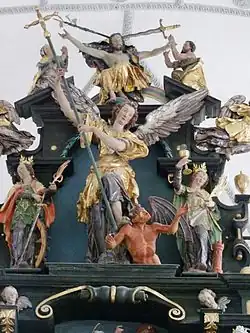 La partie centrale du retable montre le Couronnement de la Vierge par Jésus à gauche et Dieu le père à droite, dans une nuée d'anges et de putti musiciens. Aux extrémités supérieures deux anges portent les blasons du donateur et de sa femme. Séparés par des colonnes de la scène centrale, les évangélistes Matthieu et Marc à gauche, Luc et Jean à droite. Aux extrémités, nettement plus grands, Pierre à gauche et Paul à droite. La partie supérieure contient, au milieu, une Adoration des rois mages, avec des deux côtés une série de personnages ; à gauche le donateur et ses trois garçons, à droite son épouse et ses deux filles. Au-dessus, l'archange Michel terrassant le diable, entouré des saintes Catherine et Barbe, et tout en haut le Christ du jugement dernier avec à ses pieds Marie et Jean-Baptiste[4].