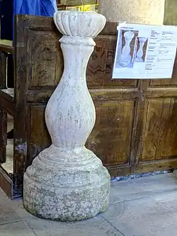 - Le bénitier est également en pierre calcaire taillée. Il mesure 92 cm de hauteur pour 40 cm de diamètre, et date de la seconde moitié du XVIe siècle ou du XVIIe siècle. Le bénitier proprement dit est une petite vasque de plan circulaire, qui s'évase vers le bas, et est sculptée de godrons. Il repose sur un pied en forme de balustre, qui est fortement disproportionné par rapport à la vasque. Ce balustre est de plan circulaire contrairement au pied de la cuve baptismale, et galbé en doucine. Son diamètre maximal dépasse nettement celui de la vasque. Avant et surtout, le volume de son socle est plusieurs fois supérieur à celui de la vasque. C'est un cylindre, dont la partie supérieure s'évase, et est mouluré de deux petits tores et d'une doucine[10].