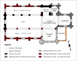| Autres campagnes de travaux | 1re moitié XVIe siècle (reconstruction bas-côtés) ; 2e moitié XVIe siècle (grandes arcades du sud, 1re travée du chœur) |