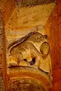 Deux chiens qui détournent la tête sont accostés à une plaque verticale. Le chien de gauche tient dans sa gueule un disque, qui a la forme d'une hostie. Tous les deux ont la queue retournée, sexualisée et qui se termine en tête de serpent. Sur leurs corps, il y a traces de polychrome rouge et bleu. Le thème des animaux impurs, sauvages ou domestiques, avalant une hostie était un rappel des risques de communion sacrilège.
