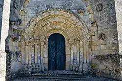 Le portail comportait, à l'origine, deux fausses portes latérales encadrant la baie centrale, et vers le haut, de chaque côté, une paire d'arcs aveugles.