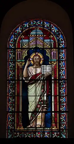 Au-dessus du vitrail central du chœur, un vitrail représente la croix des chanoinesses stylisée avec des fleurs et portant leur devise. Il a été réalisé en 1843 par l'architecte Desjardins[3].