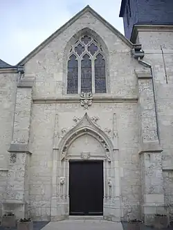 Sur la façade, le vitrail fut détruit en 1825 par une tempête, le portail en gothique flamboyant et une fleur de lys orne le tympan, le tailloir porte les armes de la ville de Vertus tenu par deux anges.