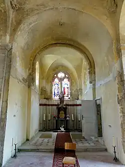 Le sanctuaire, presque aussi sobre que les croisillons, offre la disposition exceptionnelle de la succession d'une voûte en berceau et d'une voûte d'arêtes. En effet, les voûtes d'arêtes sont plus habituellement employées pour les bases des clochers (Arthies, Boubiers, Chamant, Condécourt, Cormeilles-en-Vexin, Feucherolles, Follainville, Limetz, Moussy, Orgeval, Reilly, Saint-Gervais. Seraincourt, Tessancourt…). Les chœurs sont souvent voûtés en berceau à la période romane, mais peu d'exemples se sont conservés dans la région, où l'essor de l'architecture gothique est allé de pair avec la reconstruction de la plupart des chœurs romans. Restent encore Asnières-sur-Oise, Bray, Labruyère, Laigneville, Monchy-Saint-Éloi, l'ancienne chapelle du manoir de Rouffiac à Pontpoint[16], Rieux, Saint-Clair-sur-Epte, Santeuil, la première travée de la chapelle de la Vierge de Saint-Vaast-de-Longmont, etc. La voûte en berceau n'a pas de supports. Comme souvent à l'entrée des absides voûtes en cul-de-four, le diamètre de la voûte se réduit ici, mais il n'y a pas d'arc-doubleau à proprement parler. Néanmoins, un tore à vocation décorative a été disposé sous le ressaut de la voûte (et non devant, ce qui aurait pu le gommer), et le maître d'œuvre l'a fait retomber sur deux colonnettes à chapiteaux, dont la partie inférieure est tronquée. Les chapiteaux sont ronds, comme à la période rayonnante, mais ce semble plutôt être fortuit, car la facture est rustique, et la sculpture se limite à deux rangs de feuilles simples. Des chapiteaux existent aussi dans les angles du chevet. Ici, les tailloirs sont carrés, et ont le même profil sommaire que les impostes de la croisée du transept.