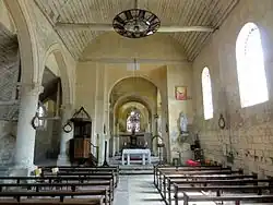 À l'intérieur, la nef ne correspond pas à ce qu'annonce la façade romane, car l'élément stylistique dominant sont les grandes arcades, purement gothiques. Sauf au niveau de la première travée (voir ci-dessous), le mur gouttereau sud est sans caractère, de même que ses fenêtres. On peut seulement noter la présence de pilastres au niveau des entraits de la charpente. Le plafond lambrissé en forme de berceau, avec quatre entraits et poinçons, ne renvoie pas à une époque spécifique, mais a cours pendant toute la période gothique. À la période classique, se répand l'usage de couvrir les lambris de plâtre pour suggérer une voûte, comme à Béthancourt-en-Valois, Béthisy-Saint-Martin, Boran-sur-Oise, Cauffry, Nogent-sur-Oise, Rully, Saint-Vaast-de-Longmont etc. ; et au XIXe siècle, se développe une prédilection pour les fausses voûtes d'ogives, comme on peut en voire à Ansacq, Balagny-sur-Thérain, Beaumont-sur-Oise, Breuil-le-Vert, Clermont, Fitz-James, Néry, La Neuville-en-Hez, Nointel, Venette, etc. D'autres exemples de berceaux lambrissés existent encore à Bailleval, Heilles, Hodenc-en-Bray, Mogneville, Monchy-Saint-Éloi, Roberval, Saint-Martin-des-Champs (Paris). Ils ne sont pas nombreux dans la région. À côté des charpentes apparentes, les plafonds plats et des solutions intermédiaires, ils constituent l'une des formes de couverture au cas où le voûtement d'ogives ne peut être envisagé, que ce soit parce que les proportions de la nef n'y sont pas propices, ou parce que les moyens financiers ne sont pas suffisants, sachant que les nefs sont à la charge des paroissiens, tandis que les gros décimateurs doivent pourvoir aux frais de construction et d'entretien des chœurs. Malgré sa simplicité, ce type de plafond est donc appréciable pour son authenticité et son absence de prétention. Comparé au voûtement d'ogives, il n'a pas seulement l'avantage d'être plus économique, mais apporte aussi une hauteur sous plafond plus importante avec une hauteur des murs gouttereaux égale.
