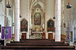 L'église possède notamment un maître autel de style gothique tardif, des autels secondaires et une chaire de style rococo. Elle est pourvue en son sud d'une chapelle latérale et en son nord d'une sacristie à deux étages, qui est restaurée vers 1597 puis complétée d'une chapelle secondaire vers 1730. La tour de l'église est construite en blocs de pierre de taille brute sur un plan carré vers 1400. Elle est ornée d'écoinçons de toit obliques. Son clocher orthogonal est pourvu d'abat-sons en arcs brisés et est complété d'une flèche vers 1870. Le tympan de la grande porte, construit au XVe siècle, comporte la peinture Christus mit Jüngern von Emmaus (« Le Christ avec les disciples d'Emmaüs », voir Lc 24,13-35), réalisée par Franz Bilko (de) en 1945–46. L'orgue, conçu par Helmut Allgäuer en 1989, est protégé par un buffet de style classique fabriqué par Josef Loyp et daté de 1837.