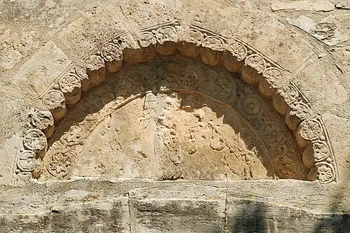 Le tympan est bordé d'un remarquable décor de rinceaux fleuris et est surmonté d'une archivolte constituée de cylindres ornés de fleurs.