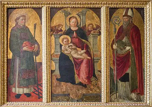 ![]() La Vierge à l'Enfant entre saint Laurent et saint Ambroise (Paolo da Caylina l'Ancien). |