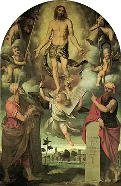 - Cristo, coi simboli della Passione, tra Mosè ed Elia (Le Christ entouré des symboles de la passion, entre Moïse et Élie), huile sur toile, 1541[6],[3] ;