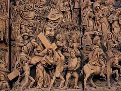 Les scènes principales sont le Portement de croix, en bas à gauche, au-dessus le Christ à Gethsémani, puis encore au-dessus, et plus petit, deux scènes avec Judas et les soldats, et la trahison de Judas. Au centre, sous la crucifixion donc, Marie en douleur et Véronique avec le suaire. Dans la partie droite, les soldats se disputent les vêtements du Christ ; au-dessus la Déposition et la Mise au tombeau. Il faut donc lire chronologiquement les scènes de la gauche vers la droite, sur la partie gauche de haut en bas, et sur la partie droite de bas en haut.