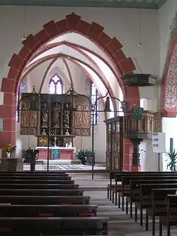 L'autel en bois sculpté est la pièce la plus précieuse de l'équipement de l'église. Ce retable est un ex-voto offert par Sibylle de Baden-Sponheim (de) (1485-1518), l'épouse du comte Philippe III de Hanau-Lichtenberg. Tous deux sont enterrés dans l'église. Jusqu'en 1513, le couple n'avait donné naissance qu'à des filles. La comtesse avait alors prononcé le vœu d'offrir un retable à l'église Saint-Nicolas si un héritier mâle lui venait à naître, chose faite en 1514 avec la naissance de Philippe IV.
