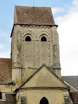 Les élévations latérales, mal visibles, sont de faible intérêt. Partout le parement des murs a été repris. On ne trouve plus de corniche, ni de moulurations ou détails sculptés d'origine. Des petites sculptures représentant les trois animaux et le personnage ailé du Tétramorphe sont exposées dans des niches des murs entourant la cour au nord de l'église. Elles ne sont pas mentionnées par Lebeuf et Régnier, qui évoquent en revanche une petite sculpture énigmatique près du portail. Louis Régnier ne l'a déjà plus vue en place, mais n'exclut pas que ce fut un Christ de pitié. Les contreforts des croisillons sont eux aussi refaits. La nef n'en possède même pas, et à ce titre, Louis Régnier signale l'absence d'arcs-boutants devant les murs gouttereaux de la nef. Mais puisque le parement a été refait, on ne peut rien en déduire quant à l'état ancien et l'existence d'un voûtement d'ogives primitif. L'absidiole a été moins radicalement restaurée que le reste, mais elle a été mutilée. La frise de dents de scie manque au sud et le toit n'est plus conique comme il conviendrait au plan en hémicycle, mais en appentis. Un pignon a donc été ajouté au sud. Le pan nord-est de l'absidiole n'est pratiquement pas visible depuis l'extérieur. Quant au chœur, l'extérieur ne garde aucune trace de la période gothique. Après le portail, le clocher est donc le seul élément digne d'intérêt. Il est flanqué, à chaque angle, par deux contreforts orthogonaux. Ils sont presque plats, comme à la période romane, et se terminent par un glacis. En outre, ils sont scandés par un glacis formant larmier, par un glacis simple et par un bandeau biseauté qui court tout autour du clocher à la limite entre l'étage intermédiaire et l'étage de beffroi. Les baies de l'étage de beffroi sont au nombre de deux par face, partiellement bouchées à l'est et presque entièrement bouchées au sud. Elles sont entourées de doubles archivoltes sans chapiteaux ni colonnettes, ce qui n'est pas sans rappeler les dispositions autour de la croisée du transept. Les murs se terminent par une corniche de modillons sculptés en masques. Chacun des pignons est percé de deux étroites ouvertures en plein cintre. Louis Régnier qualifie le clocher de remarquable de sobriété, d'équilibre et de proportion[16].