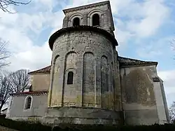 L'église est orientée est-sud-est/ouest-nord-ouest. À l'ouest, le portail, la nef de trois travées et ses deux collatéraux sont de style néo-roman. L'avant-chœur et le chœur datent de l'époque romane alors que la nef a été, selon Jean Secret, « défigurée à l'époque moderne »[2]. Le clocher carré surmonte l’avant-chœur « voûté d'une coupole sur pendentifs »[2] ; sa base est romane et sa partie sommitale est néo-romane[3]. Le chœur voûté en cul-de-four forme une abside hémicirculaire[3] renforcée extérieurement par huit contreforts encadrant sept arcs en plein cintre[2] dont quatre sont aveugles et trois percés de baies.