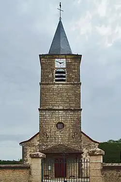 Le clocher du XIXe siècle carré et massif qui surplombe la façade ouest est surmonté d’une flèche polygonale et le portail est précédé d'un petit porche couvert d'un toit.