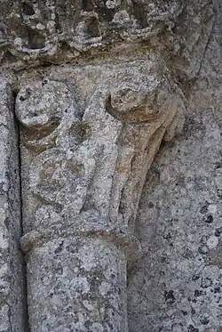 Les voussures du portail sont encore telles que les décrit Léo Drouyn en 1855[5], sauf la première, refaite en 1862 en dents de scie. Les six chapiteaux du portail sont de facture fruste. Cinq ont une décoration à feuillages (feuilles d'eau ou de palmettes renversées). Le sixième chapiteau, sur l'ébrasement nord, est une composition animalière : une bête bicorporée, à tête unique. Les deux corps, aux queues entrelacées, sont disposés dos-à-dos pour dessiner un oméga (Ω) majuscule.