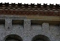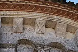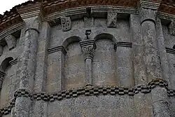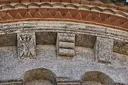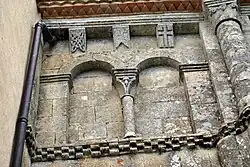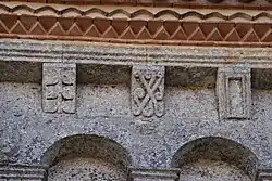 Dans chaque pan, la corniche est supportée par trois modillons. Au total, 23 modillons sont sculptés avec des figures géométriques, entrelacs, damier, etc. quatre étant abimés ou lisses. Il n'y a aucun modillon figuré. Cette série de modillons est plus tardive que la série qui orne la façade occidentale.