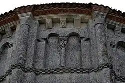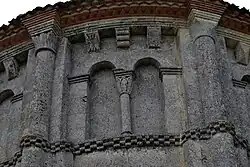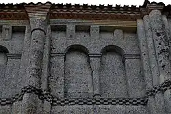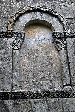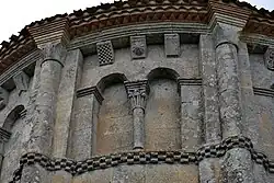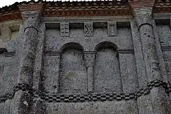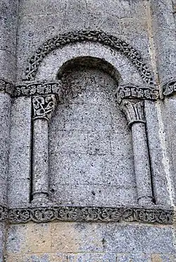 Les neuf arcatures aveugles doubles ont toutes un chapiteau central sculpté avec un décor végétal.