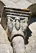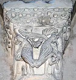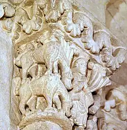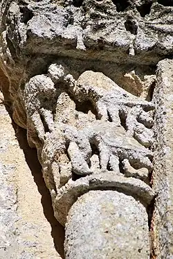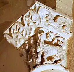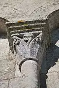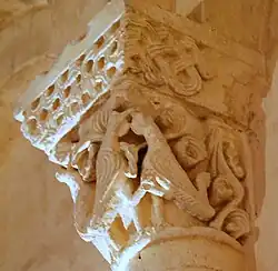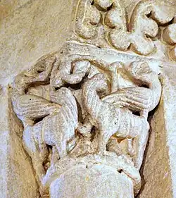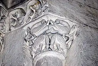 Les deux chapiteaux qui encadrent la fenêtre axiale de l'abside sont également des exemples d'animaux superposés.