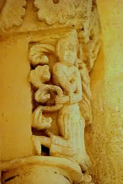 Entre le onzième chapiteau et la fenêtre nord se trouve une console qui soutient l'arc de la fenêtre nord. Sur la console, figure un homme barbu, à longs cheveux. Il est en génuflexion, le dos courbé. Il tient sa barbe de sa main droite et sa main gauche est posée sur son genou gauche. Cette sculpture, invisible de la nef, dans un endroit réservé aux clergé, avait une signification très négative pour eux. On trouve une sculpture semblable sur le cordon du sanctuaire de l'église de Saint-Martin-de-Sescas.