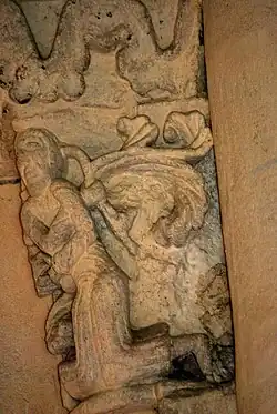 La représentation est symbolique. Face à des bêtes féroces, les gestes de l'homme sont suspects et indiquent un désir de rapprochement avec le lion, qui, selon l'expression de saint Pierre, n'est autre que « le Diable cherchant qui dévorer ». Ce sujet était le traditionnel contre-exemple de la représentation de Daniel dans la fosse aux lions, qui se trouve ici sur le chapiteau no 7.