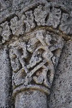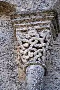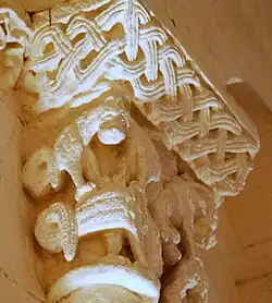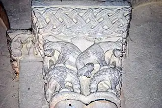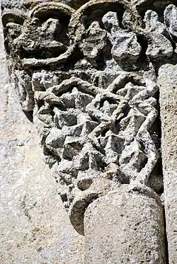 L'ornementation du tailloir associe des entrelacs nattés sur les deux côtés et des alvéoles sur la face principale.