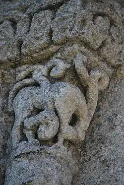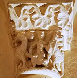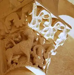 Sur la corbeille du chapiteau sud, un mammifère (un lion ou un loup) est montré de profil, sa longue queue dessinant une boucle. Il est opposé à deux serpents. Le premier serpent commence par enlacer la queue du lion, puis descend sur son flanc et se tourne pour happer sa cuisse gauche. Le second serpent, quant à lui, mord la patte avant droite de l'animal, alors que ce dernier vient de lui saisir le cou entre ses canines.