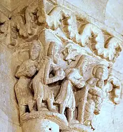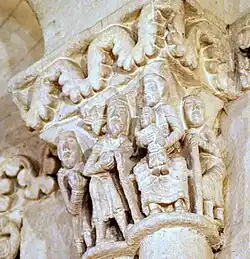 C'est le personnage central qui donne le sens à cette composition, sans doute une scène euphorique, car on discerne la jubilation sur les visages des deux hommes. Il existe un chapiteau complet, très semblable à celui-ci, dans le sanctuaire de l'église de Saint-Macaire. La troisième personne est une femme lascive, qui laisse supposer que le personnage central ici est un épigone de la luxure, soit une sirène-oiseau, soit une fille de joie.