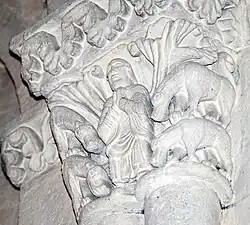 La paysanne du chapiteau no 4 porte une robe dont le style est totalement étranger à l'époque romane. Les deux bêtes sont d'une espèce inconnue. Il est vraisemblable que cette paysanne a remplacé une autre effigie féminine, qui, vu le contexte des autres chapiteaux, était un rappel au clergé contre la tentation charnelle.