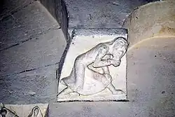 Cette sculpture participe à la typologie de « la Faute » : la représentation frontale du corps agenouillé n'est pas une allégorie du mystique en prière, surtout quand les jambes sont déjetées latéralement ; au contraire, il est question de grands pécheurs, le plus souvent figurés nus, les jambes écartées et évoluant dans un contexte végétal diabolisé. La sculpture, invisible pour les fidèles pendant l'office, était un rappel de moralité destiné au clergé.