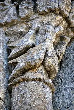 Un homme de grande taille s'est agenouillé dans l'axe du chapiteau. Il a croisé les bras pour s'agripper aux deux tiges tortueuses qui s'épanouissent latéralement en feuilles grasses.
