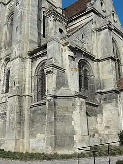 Le long des murs gouttereaux, les larges fenêtres prennent appui sur un mur-bahut terminé par un glacis. Elles sont en plein cintre, et pourvues d'un réseau très simple composé de trois formes en plein cintre. Celle du milieu est plus élevée que les autres, et flanquée de deux accolades. Les meneaux ont des bases prismatiques rudimentaires. Sous chaque fenêtre, le soubassement est animé d'un panneau rectangulaire entouré de fines moulures. Au revers de la façade occidentale et au chevet, les fenêtres sont plus étroites. Dépourvues de remplage à l'ouest, elles sont dotées d'un remplage Renaissance standard à l'est, composé de deux formes en plein cintre, surmontées d'un oculus. Dans tous les cas, les arcs brisés des formerets voisinent avec les pleins cintres des fenêtres, ce qui n'est pas du meilleur effet. Quatre voûtes sur un total de dix, en ne comptant pas les deux travées romanes, quittent le schéma de base d'une voûte à quatre branches d'ogives. Dans le bas-côté nord, c'est la seconde, la quatrième et la sixième voûte ; dans le bas-côté sud, c'est la sixième voûte. Dans la seconde travée du nord, le sommet de la voûte est agrémenté d'une couronne en pierre, reliée aux sommets des arcs d'inscription par des liernes. Dans la quatrième travée, un losange remplace la couronne. Les voûtes des sixièmes travées ou chapelles sont analogues à la voûte de la quatrième travée du vaisseau central. Les clés de voûte sont pendantes et richement décorées. Celles de la chapelle de la Vierge ont fait l'objet d'un soin particulier, et elles sont finement ciselées[12],[13],[6],[20].