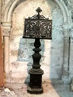 - Le lutrin en fonte de fer de la seconde moitié du XIXe siècle, fabriqué par A. Brochon à Paris, est proche des réalisations en bois taillé de l'époque précédente. Le pied est un balustre en double poire reposant sur un piédestal. Le pupitre est largement ajouré de rinceaux, et couronné par une croix rayonnante. Parmi les motifs, on trouve le Sacré-Cœur, des arabesques, des palmettes et des fleurs[39].