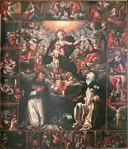 - La Madone du Rosaire, tableau anonyme de 2,80 m de haut et 2,50 m de large, est une œuvre classée monument historique[33]. Au centre, la Vierge avec l'enfant Jésus est représentée au milieu d'anges musiciens avec en bas à gauche saint Dominique, fondateur de l'ordre des dominicains, et à droite sainte Catherine de Sienne. Tout autour sont disposés quinze médaillons représentant les mystères du rosaire ; on reconnait en haut dans le coin gauche l'Annonciation, puis dans le sens inverse des aiguilles d'une montre, la Visitation, la Nativité, la présentation de Jésus au Temple, Le recouvrement de Jésus au Temple, l'agonie de Jésus, la flagellation, le couronnement d'épines, le portement de Croix, la mort de Jésus, la Résurrection, l'Ascension, la Pentecôte, Assomption et le couronnement de la Vierge.