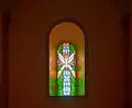 Dans la niche se trouve une statue polychrome de saint Pierre, figuré avec le coq.