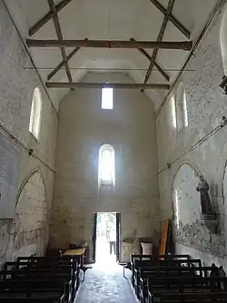 La troisième campagne de construction intéressant la nef est celle des parties orientales, dont fait partie l'arc triomphal ouvrant sur le carré du transept. Il est presque aussi large que la nef, et aussi élevé que les murs gouttereaux. Si la nef avait été voûtée, sa hauteur aurait donc été alignée sur celle du carré du transept et du chœur, mais en l'occurrence, l'absence de voûtement, avec un plafond à trois pans et une charpente partiellement apparente, sans poinçons, donne une hauteur plus importznte. À gauche et à droite de l'arc triomphal, les contreforts occidentaux du clocher font très légèrement saillie devant les surfaces murales. L'arc est en tiers-point, légèrement surhaussé, et à double rouleau. L'intrados est profilé d'un méplat entre deux tores, et le rang de claveaux supérieur est mouluré d'un tore dégagé de chaque côté. La retombée s'effectue sur les tailloirs carrés, sommairement moulurés d'une plate-bande, d'un biseau et d'un mince filet, de chapiteaux de crochets, qui ne montrent que de légères variations, et sont représentatifs des premières décennies du XIIIe siècle. Un personnage grossièrement sculpté se dégage toutefois à l'angle sud-ouest du petit chapiteau du nord. Le chapiteau correspondant au rouleau inférieur est plus grand que les autres, et il en va de même du fût associé. Il est appareillé, et partiellement engagé. Les fûts plus minces du rouleau supérieur sont cylindriques, et logés dans des ressauts des piles du clocher. Pour venir à la quatrième campagne de construction, elle concerne les fenêtres hautes de la nef. Elles sont en arc brisé, et entourées d'une gorge tant à l'intérieur qu'à l'extérieur, ce qui indique généralement le style gothique flamboyant qui s'impose après la guerre de Cent Ans. Quant aux murs du nord, de l'ouest et du sud, ils devraient partiellement remonter au début du XIIe siècle, mais comporter aussi des parties plus récentes. Ils sont bâtis en moellons noyés dans un mortier, et blanchis à la chaux. Des traces de peintures murales ornementales sont visibles à plusieurs endroits, notamment autour des fenêtres et au revers de la façade. Le mur occidental de la base du clocher est en revanche badigeonné, parfaitement lisse, et peint en faux-appareil[2],[3].