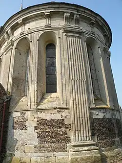 Les parties droites des croisillons sont ajourées d'une seule baie à l'ouest et à l'est, qui est très petite à l'est, et poussée haut sous la voûte, afin de laisser la place à des retables. Les absides en hémicylce comportent trois sections définies par des pilastres, avec deux baies géminées par section, ou un grand œil de bœuf au chevet. Des sections d'entablement sont engagés dans les murs à la limite des allèges, sans qu'il y ait des pilastres pour les supporter. Les trois niches par croisillon sont voûtées en cul-de-four, avec un bandeau mouluré à la retombée de la voûte. Le plafond à caissons de la niche au chevet du croisillon sud est particulièrement soigné. Il semble porté par deux chérubins potelés, qui sont placées horizontalement à sa retombée, et tiennent un cartouche avec les meubles du blason du cardinal de Pellevé : de gueules, à la tête humaine d'argent, posée de profil, les cheveux hérissés d'or (de Pellevé), et d'argent semé de fleurs de lys de sable (Faÿ). — Le chœur possède deux travées droites, et les soubassements des fenêtres sont nus. En revanche, des niches à statues sont ménagées dans les trumeaux des sections en hémicycle, au nord et au sud, comme dans la nef. Sinon, le chœur est en tous points égal aux croisillons. Quant à la voûte, elle est décorée de larges bandeaux. Un bandeau correspond à la ligne faîtière. Des bandeaux perpendiculaires commencent au-dessus de chaque pilastre, ainsi qu'au-dessus des trumeaux de la nef. Ainsi les bandeaux délimitent les différentes travées, et les sections des hémicycles des absides. Ils sont entièrement sculptés de motifs ornementaux. Dans la nef, ce sont uniquement des rosaces inscrits dans des losanges. Ce motif revient dans les croisillons, où le motif le plus fréquent sont des coquilles Saint-Jacques affrontées, qui alternent avec des rosaces inscrites dans des cercles. Dans le chœur, des gerbes alternent avec une rosace inscrite dans un losange, puis une rosace inscrite dans un cercle. Un motif sur deux bénéficie d'une polychromie architecturale. Bernard Duhamel qualifie l'entablement de « pesant », et la brièveté de son étude traduit son manque d'enthousiasme face au monument, tandis que Louis Graves dit que « cet édifice est noble et élégant »[5],[6].